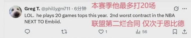 球迷说他俩是数一数二的烂合同,也在情理之中。恩比德本赛季一直有出场时间限制,而且不打背靠背的比赛。结果恩比德刚打了6场比赛,因为右膝盖酸痛再次休战。他已经连续缺席了2场比赛,目前是每日观察的状态,归期未定。